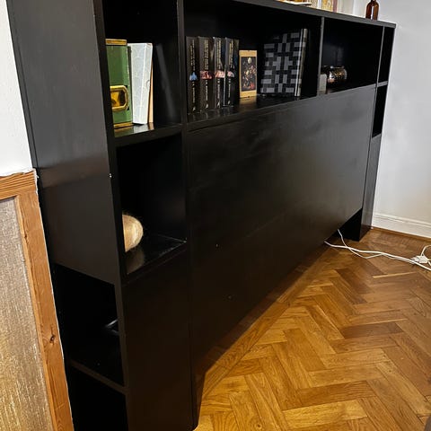 1. Hylla från Mio med små skavanker, typ små repor, men inget man direkt lägger märke till. Det finns tre hyllplan till skåpet också. Längd 180m, bredd 29cm = 900kr