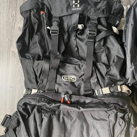 Lundhags ryggsäck v12 90 l. Nyskick, Med regnskydd, liten ryggsäck med fickor som man kan koppla loss till egen ryggsäck.