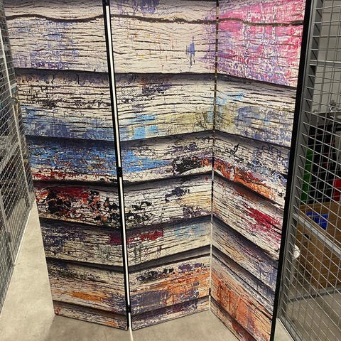 Rumsavdelare/ klädhängare ,i bambu med naturfärgad finish. Skärmen har flätade sidopaneler och dekorativa bågar och ramar. Monterad på små hjul för att enkelt kunna flyttas. Passar som avskärmning eller inredningsdetalj i exempelvis vardagsrum, sovrum eller hall.
