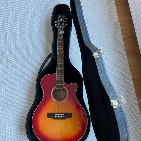 Gear4music akustisk gitarr i sunburst-finish. Gitarren har sex strängar, stålsträngar och cutaway-kropp för enklare åtkomst till högre band. Med följer tillbehör som stämapparat, capo, extra strängar och plektrum samt vadderat fodral enligt bilderna. Passar för akustiskt spel i olika musikstilar.