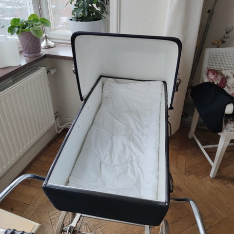 Chassi, liggdel samt sittdel, åkpåse i ull, babylift samt övriga tillbehör.