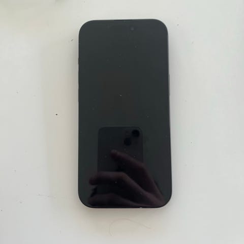 Apple iPhone 15 mobiltelefon i svart färg. Inga sprickor fram eller bak. Funkar som den ska, batteri hälsa på ish 87% kan möjligtvis följa med ett skal. Visas i bilden