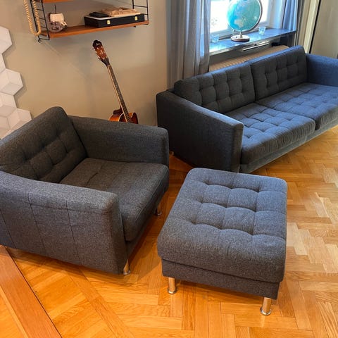 4 år gamla BoConcept soffa och fåtölj i Turqoise färg.