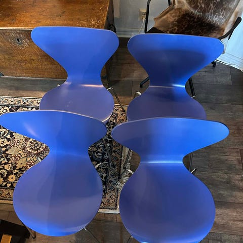 Sex unika skalstolar LILJAN/MÅSEN, formgivna av den legendariske danske designern Arne Jacobsen, i nära nyskick säljes privat i Limhamn.