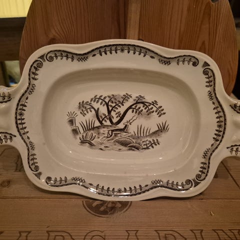 Klassiskt och vackert djupt uppläggningsfat (även kallat skålfat/karott) från Gefle Porslinsfabrik. Dekoren heter Stjärnsund och är formgiven av Eugen Trost, producerad under perioden 1943–1958. Modellen har en elegant vågig reliefkant och ett tidlöst, detaljerat blommönster i mörkgrått på en ljus botten. En perfekt serveringsdel för till exempel potatis eller grönsaker, och en stilfull svensk inredningsdetalj med genuin vintagekänsla. Godset är i ett fint begagnat åldersskick med charmig patina och åldersrelaterad krackelering i glasyren, utan nagg.