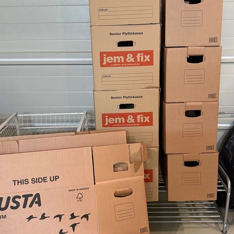 Garage-rensning. Sortiment skruvar och muttrar i plastbackar