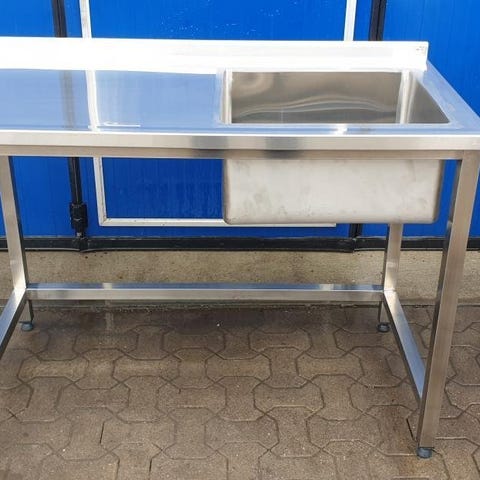 Diskbänk med rostfri arbetsyta och ho, undersats med metallstomme och utdragbara trådkorgar samt hylla i trä. Tillhörande väggskåp med två dörrar och ett justerbart hyllplan invändigt. Passar exempelvis i tvättstuga, grovkök eller förråd för förvaring och enklare disk- eller rengöringsarbete.