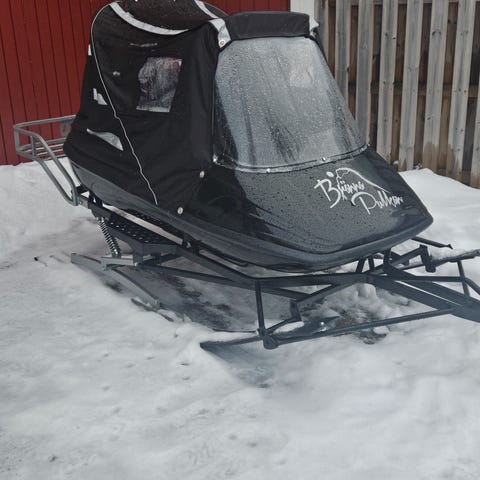 Brännapulka med plats för två personer, det finns även möjlighet att lastas i lådan bak samt på packhållaren. Ny ruta monterad, plastbelag på medarna. Kapellet är något blekt men fortfarande fungerande. Finns i sångbäcken fram till torsdag.