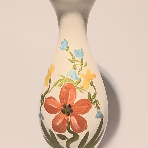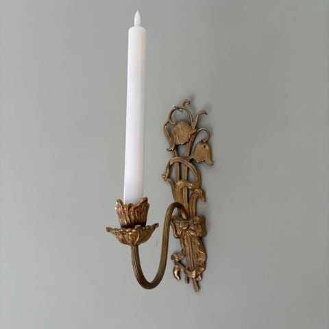 Väggljusstakar i keramik med handmålat blommönster i rosa, grönt och brunt på ljus bakgrund. Ljusstaken är avsedd för kronljus eller liknande smala stearinljus och har en integrerad hållare längst ned. Baksidan är slät för montering på vägg. Passar som dekorativ belysning i exempelvis vardagsrum, hall eller kök.