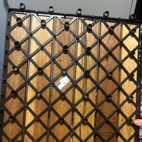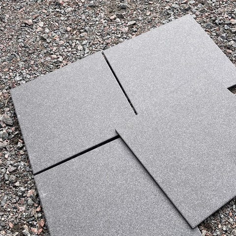 Plastgolv bestående av sammankopplingsbara plattor i grå färg. Plattorna har ett perforerat mönster som släpper igenom vatten och smuts, vilket gör dem lämpliga för exempelvis altan, balkong, källare, garage eller andra utrymmen där dränering är önskvärd. Golvet kan byggas ihop till önskad storlek genom att klicka ihop plattorna.