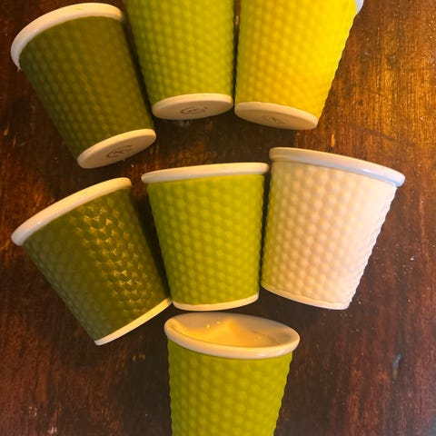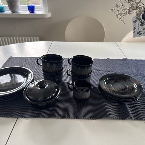 Säljer ett set med 10 assietter, 17 cm i diameter, samt en matchande kaffekanna. Perfekt för fika eller små sammankomster - det är från 70-talet.