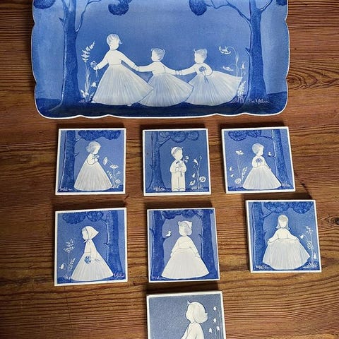 Höganäs porslinstallrikar med motiv. Serien visar illustrerade figurer och är dekorerad i en blågrön ton. Tallrikarna är åttakantiga med bräddad kant. På undersidan finns stämpel Höganäs och serienamnet. Passar som mattallrikar, serveringsfat eller som dekorativa samlartallrikar.