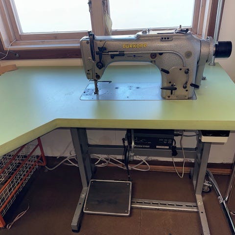 Industrisymaskin med integrerat arbetsbord. Maskinen är monterad i ett större arbetsbord med plats för materialhantering runt maskinen. Passar för professionellt eller halvprofessionellt bruk inom sömnad och textilarbete. Frakt lösningar enl. ök.