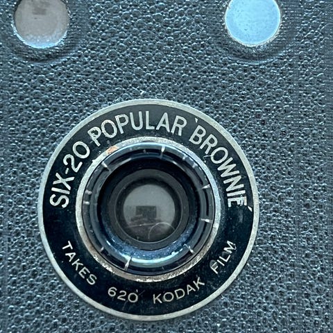 Kodak No. 2 Brownie Model C boxkamera i svart utförande. Kameran är en klassisk lådkamera avsedd för rullfilm, med enkel sökare och bärhandtag på ovansidan. Utsidan är klädd i svart material med metallbeslag. På insidan finns märkning med modellbeteckning och patentnummer. Passar som samlarobjekt, inredningsdetalj eller för den som är intresserad av äldre kamerateknik.