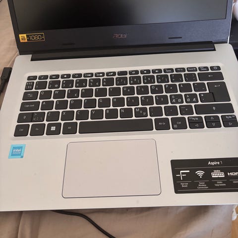 windows 11 på. Funkar bra. Acer bärbar dator i silverfärg med 14-tums skärm. Datorn har Intel Core i5-processor (11:e generationen) och 16 GB RAM-minne enligt visad systeminformation på skärmen. Tangentbord i fullstorlek med styrplatta under, samt integrerad webbkamera ovanför skärmen. Passar för vardagligt kontorsarbete, studier och webbanvändning. Nätadapter med kabel syns på bilden som tillbehör.