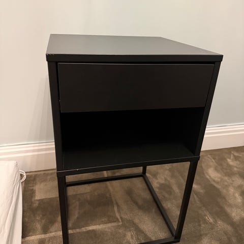 2 st Sängbord/avlastningsbord i mycket fint skick. Ikeas Vikhammar. Mått 60 x 39, höjd 65 cm. Stor låda och ett hyllplan. Pris 450 kr/st. ( nypris 995 kr/st).
