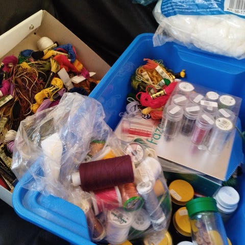 Ramar, spetsar,mönsterpapper, bambuv äskhandtag, broderigarnlåda, DMC-broderigarn, broderiväv, knappnålar etc