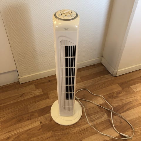 Svart tornfläkt för inomhusbruk. Fläkten står på en rund fot och har ett smalt, högt tornutförande som tar liten golvyta. På ovansidan finns ett digitalt kontrollpanel med knappar för av/på, fläkthastighet, timer och olika lägen. Strömsladd med stickkontakt ansluts till vanligt vägguttag. Passar för användning i exempelvis vardagsrum, sovrum eller kontor för cirkulering av luft.
