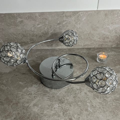 kristallinspirerad design i silverfärg. dekorativa bågar och ringar med pärl- och kristalliknande hängen i klar plast, vilket ger ett glittrande uttryck. Passar som belysning i exempelvis vardagsrum, sovrum eller hall där man önskar en mer dekorativ takarmatur.