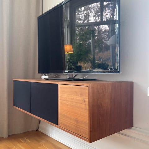 Bolia väggmonterad tv-bänk och hyllor vita stommar med valnötsluckor