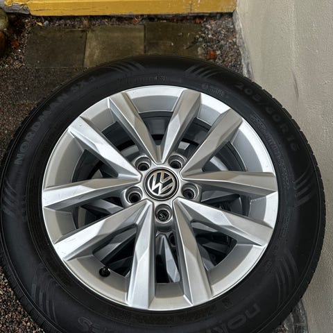 Säljer ett set däck med original toyota fälgar på. Tre av däcken är i bra skick med normalt slitage. Ett däck har tyvärr ett hål och är trasigt, se bild.