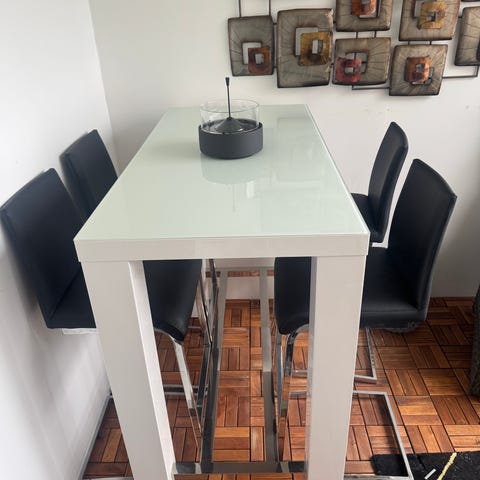 Säljer ett svart glasbord från Trademax med 6 st stolar. Stolarna är från Jysk.