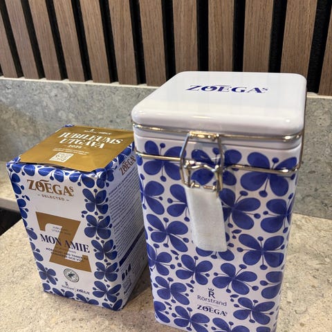Rörstrand Zoégas burk i plåt med vit bas och blått blommönster. Fyrkantig form med lock och metallklämma. Passar för förvaring av till exempel kaffe, te eller torrvaror i kök. Burken är märkt med Rörstrand och Zoégas på utsidan samt streckkod på undersidan.