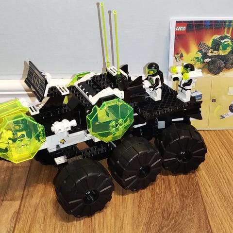 LEGO Blacktron 6887 Allied Avenger rymdskepp med en minifigur, en liten bil och en liten rymdfarkost. Instruktioner för byggnation medföljer.
