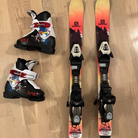 Slalomskidor 80 cm, pjäxor och stavar