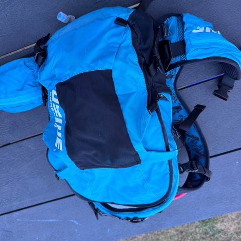 B’Twin ryggsäck med integrerat vätskesystem i svart och blått.