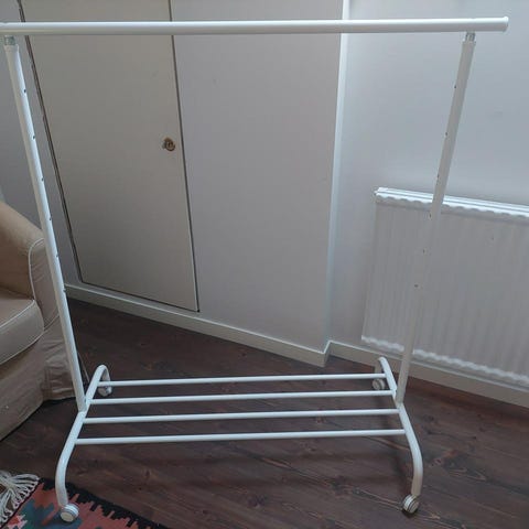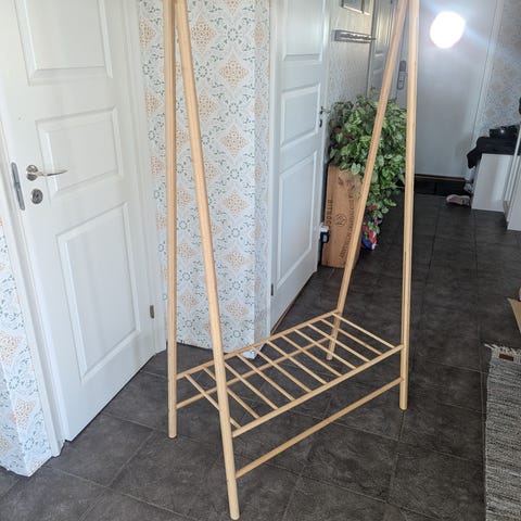 Fristående klädhängare i ljust trä.