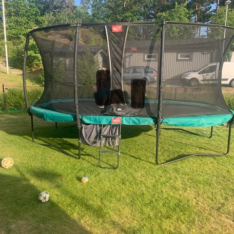 Studsmatta med förstärkt säkerhetsnät samt säkerhetsnät för insida. Toppringen ger nätet extra spänst. Ben i galvaniserat stål, 70 galvaniserade fjädrar med slittålig hoppduk