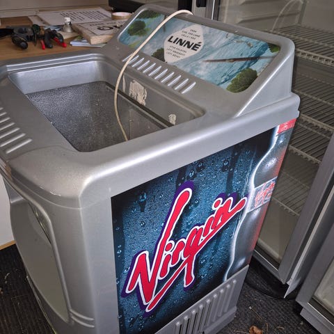 Carrier V110 kylskåp med glasdörr. Kylskåpet är ett stående modell med flera justerbara gallerhyllor för förvaring. Glasdörren gör innehållet synligt från utsidan, vilket passar exempelvis butik, café eller förråd där man vill ha överblick över kylda varor. Invändig belysning och vit interiör. Drivs med el enligt märkplåt inne i skåpet. Lämpligt för kylförvaring av dryck och livsmedel inom rekommenderat temperaturområde enligt tillverkarens specifikationer. Bredd=60 cm, Djup=60cm, Höjd=85cm