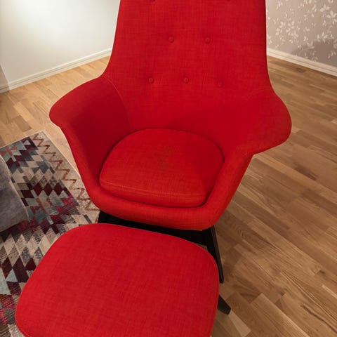 Ikea fåtölj med fotpall i grått tyg. Fåtöljen har stoppad sits, rygg och armstöd samt snurrunderrede i trä. Ryggstödet är högt med vadderat nackstöd och kan lutas bakåt för mer tillbakalutad sittställning. Fotpallen är klädd i samma grå tyg och har stoppad ovansida för att ge stöd åt benen. Passar som läsfåtölj eller vilfåtölj i vardagsrum eller arbetsrum.