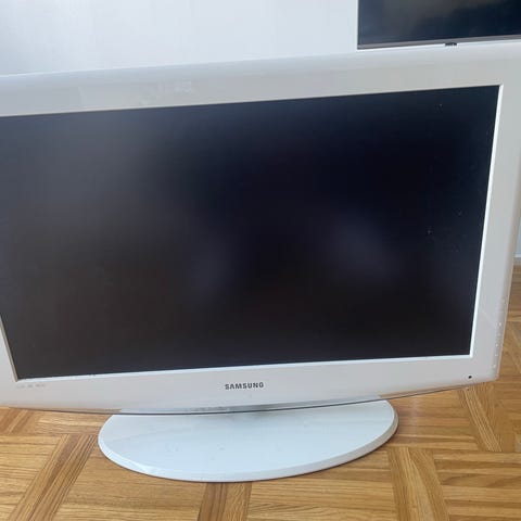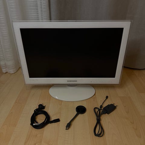 Samsung tv i vit färg. Mindre modell som passar exempelvis kök, sovrum eller kontor. Levereras med fjärrkontroll enligt bild. På baksidan finns olika anslutningar för bild och ljud samt ett väggfäste/arm monterat på tv:n. Exakt tumstorlek och modellbeteckning framgår inte av bilderna.