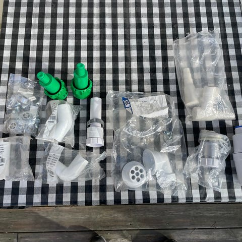 Avloppssats med vattenlås i vit plast. Innehåller rördelar och anslutningar för montering av avlopp, exempelvis under tvättställ eller diskho. Levereras i förpackning med tillhörande kopplingar enligt bild.