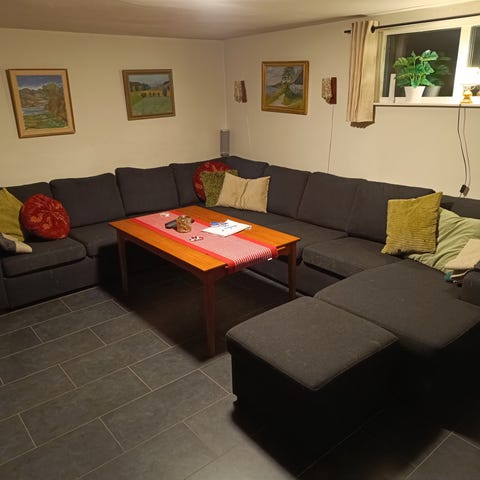 Mega soffa med plats för minst 8 pers. Grå i färgen.