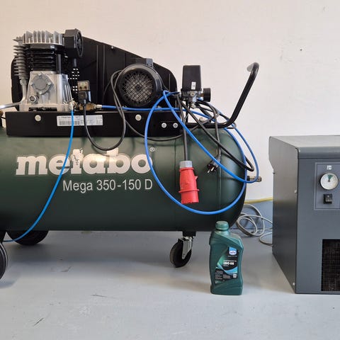 Intertec Drift-Air NGB-270C-7.5TK kompressor med elmotor på 5,5 kW (7,5 HP) för trefas 400 V/50 Hz. Utrustad med horisontell trycktank, hjul och handtag för förflyttning samt manometer och reglage på tankens ovansida. Tillverkad i Italien 2023 enligt märkplåt. Lämplig för tryckluftsdrivna verktyg och andra applikationer som kräver stationär kompressor med större luftkapacitet.