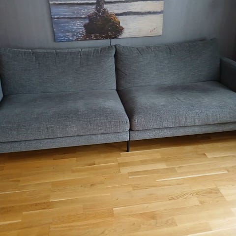 Soffan är inköpt 2022 och är i utmärkt skick så när som på ett litet, knappt synbart, hål i tyget på baksidan av en av ryggkuddarna, se foto. Nytvättad klädsel.