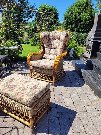 Till stolarna medföljer blå dynor som ger både extra komfort och en fin färgklick till uteplatsen.