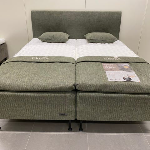 Kvalitetssäng från InBed Sweden. Handtillverkad i egen fabrik. Denna säng var en av deras lyxiga varianter med tryckavlastning för både komfort och funktionalitet. För extra flexibilitet kan du vända på mellanmadrassen för att välja mellan en mjukare eller fastare känsla. 2 x 90 cm sängar, mellanmadrass och bäddmadrass. Ca 83 cm hög inkl. ben. Mellangrå plyshtyg.