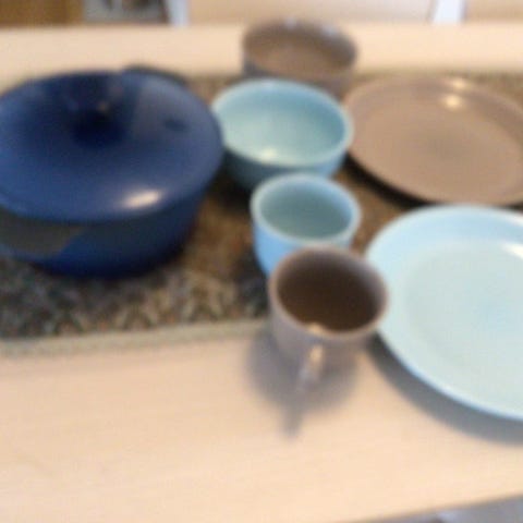 Porslin kaffeservis med romantiskt motiv i flera delar. Servisen består av kaffekanna med lock, sockerskål med lock, gräddkanna, koppar och fat. Delarna är i vitt porslin med blå dekor och guldfärgade detaljer samt motiv med romantiskt par. Undersidan är märkt "Made in Japan". Passar för servering av kaffe eller te i hemmet eller vid mindre bjudningar.