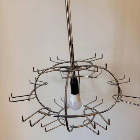 En designerlampa som ramlade ned behöver någon lite mer händig person än vad jag är för att komma till sin rätt. Alla delar finns kvar. Elektroniken fungerar förutom 1 lampa jag inte får liv i, kan nog lagas om man vill men lyser ändå lite för starkt om alla 30 är tända. Fyra armar är lösa och behöver fästas på något sätt.