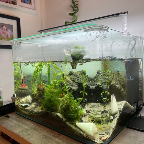 Akvarium i glas, rektangulär modell med täcklock och inbyggd belysning. Inredningen består av sand- eller grusbotten, rötter, stenar och levande växter. I akvariet finns mindre stimfiskar. Utrustning som filter och cirkulationspump syns monterad i bakgrunden. Passar för sötvattensfiskar i hemmamiljö. Storleken framgår som medelstort akvarium 60liter .