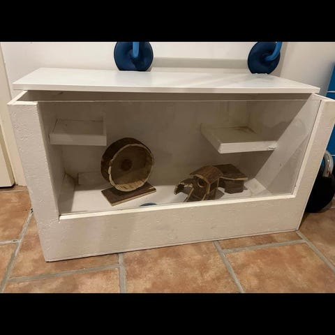Hemmagjord trälåda i OSB-skiva med rektangulär form. Lådan har ventilationsgaller i metall på ena sidan, inramat av trälister, samt ett handtag på utsidan för enklare förflyttning. Invändigt är lådan förstärkt med träribbor i hörnen. Lämplig som förvaringslåda eller bur/prototyp för mindre djur, beroende på behov och kompletteringar.