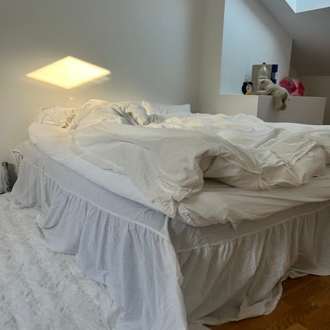 Enkel säng med vit sängkappa. Passar som enkelsäng i sovrum eller gästrum. Sängen är placerad mot vägg och under fönster, vilket kan ge bra utnyttjande av rumsytan. Vit textil runt sängen ger ett enhetligt och neutralt intryck som är lätt att kombinera med annan inredning.