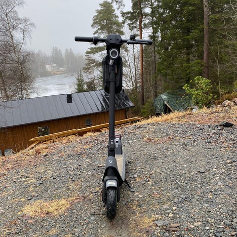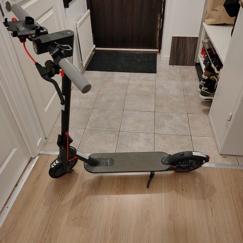 Elsparkcykel i svart färg med fram- och bakbelysning. Modellen har display på styret som visar hastighet och batterinivå. Utrustad med handtag i ljusgrå färg och reflex-/ljusdetaljer på hjul och bakdel. Passar för persontransport på kortare sträckor på asfalt och liknande underlag.