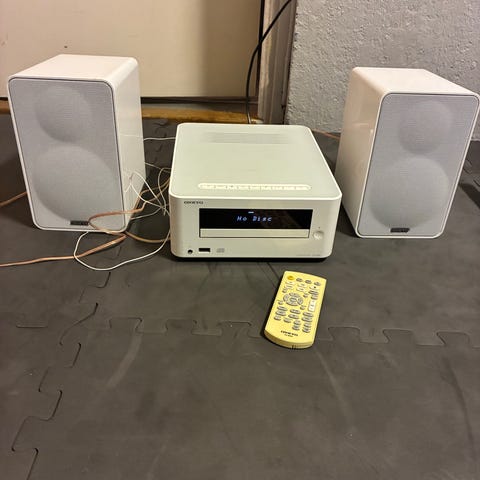 Sony stereoanläggning med flera matchande högtalare i silverfärg. Anläggningen består av centralenhet med cd-spelare och radio samt flera satellithögtalare och en större basenhet/subwoofer. Passar för användning i vardagsrum eller mindre rum där man vill ha ett komplett ljudsystem med flera högtalare. Alla delar är i samma färg och design för en enhetlig uppställning.