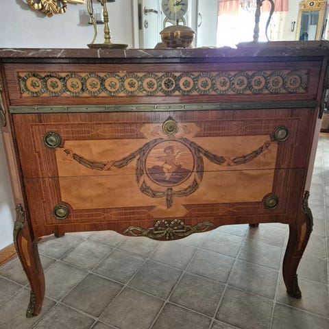 Möbeln har två stora lådor med dekorativa metallbeslag och nyckelhål. Svängda ben och profilerad front ger en klassisk stil. Passar som förvaringsmöbel i exempelvis vardagsrum, sovrum eller hall.