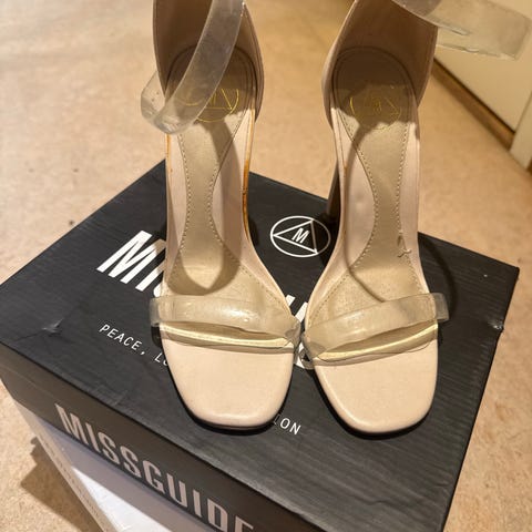 Använda och har synligt slitage, främst på klackspetsarna (se bilder). Klackspetsarna kan behöva bytas framöver. I övrigt hela och fullt användbara.